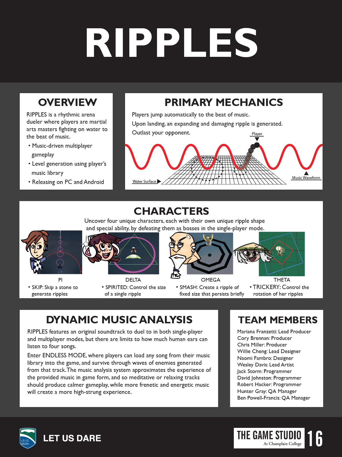 Concept Statement: Ripples is a rhythmic arena dueler where players are martial arts masters fighting on water to the beat of music. Players jump automatically to the beat of music, and generate a damaging ripple when landing on the water’s surface. The player’s offensive and defensive options are collapsed into movement, which is in turn dictated by the music. Ripples is an experience where music is not just an accessory to the mechanics, but a driver of action.